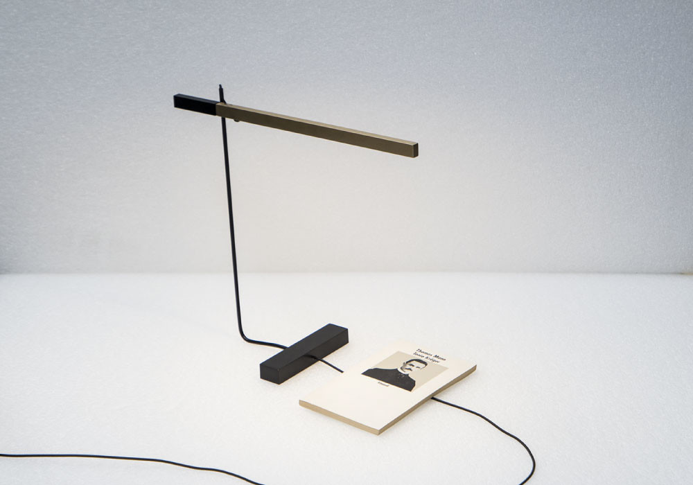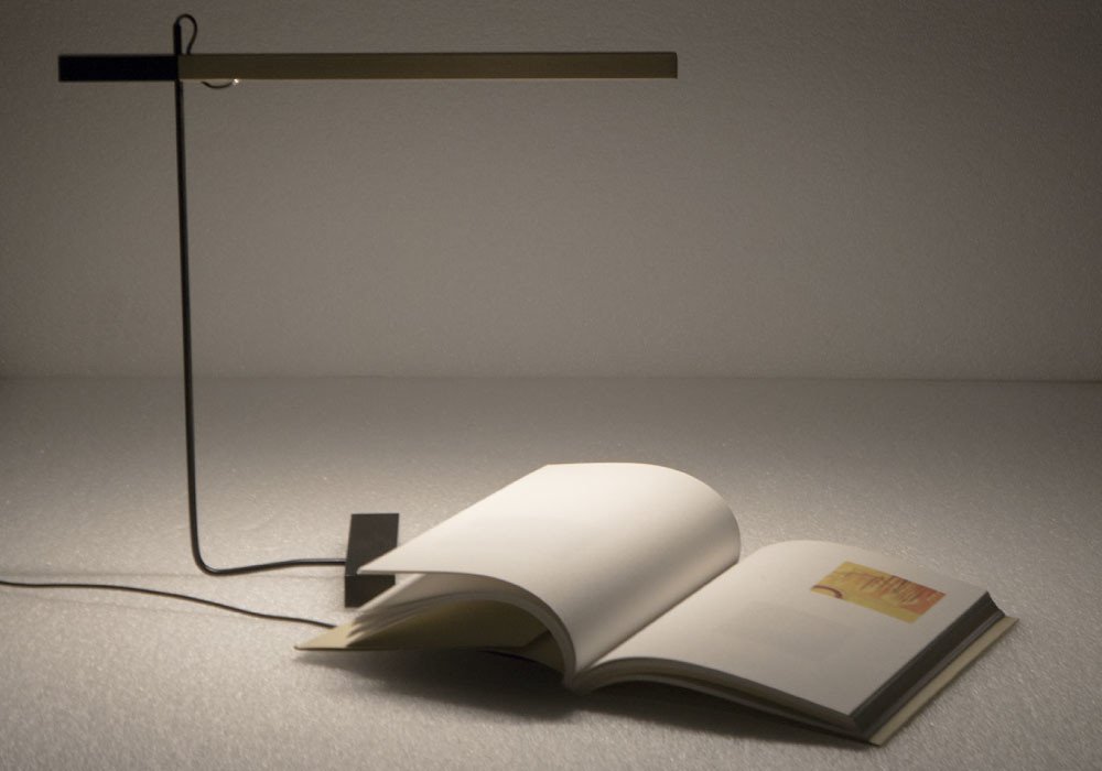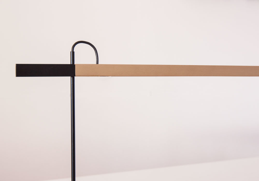 Una statica essenziale, fatta di linee orizzontali e verticali, accoglie la sottile lama di luce, con un effetto complessivo che ambisce alla bidimensionalità. La forma esile sublima i metalli e lascia alla luce il ruolo di protagonista.