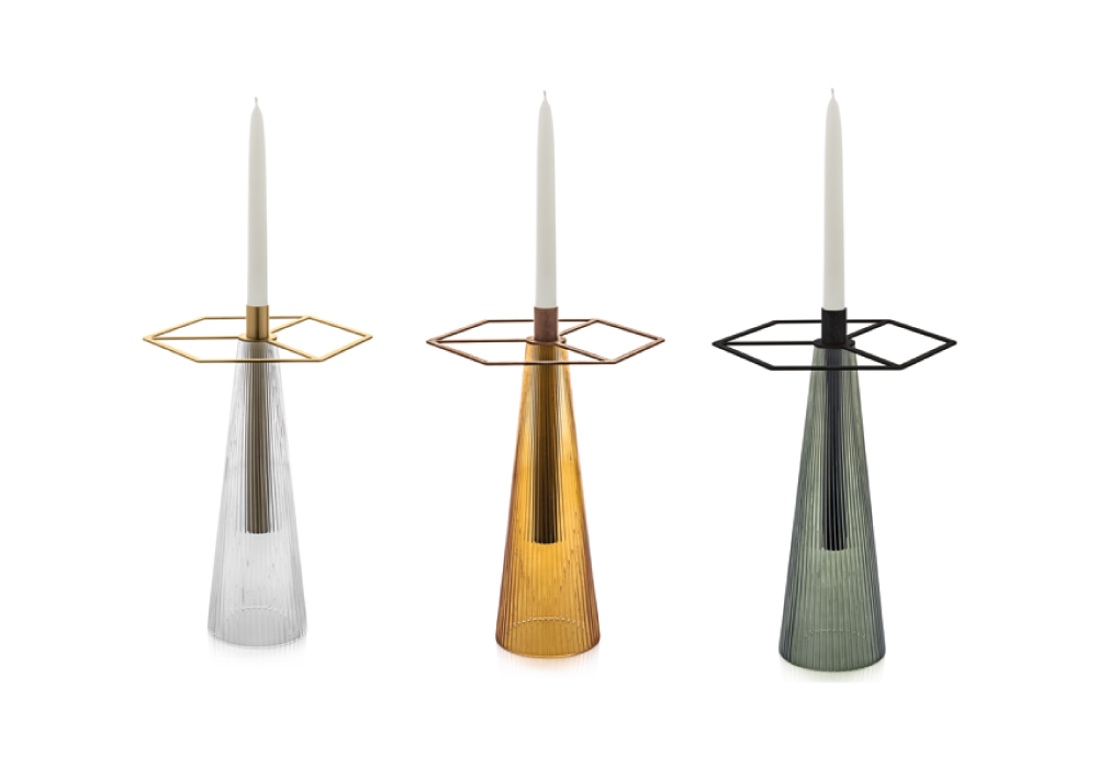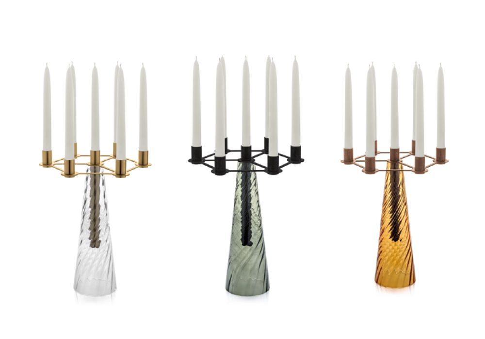 La candela fa luce su uno spazio bidimensionale trasformandolo in vibrazione tridimensionale; giochi di luce sul vetro, minimale o elaborato da decori/trasformazioni della superficie, trasparente o colorata, creano un sistema di luci in una reinterpretazione formale del classico candelabro; in modo inaspettato la parte strutturale è generata dal materiale fragile (il vetro), sopra un’illusione grafica diviene struttura metallica e portacandele.