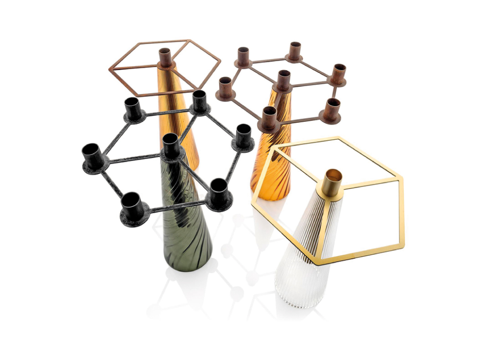 Un prodotto unico grazie alla lavorazione dei materiali: al vetro soffiato che assume sfumature e riflessi ed al metallo lavorato su diverse soluzioni (dall’ottone satinato al corten per finire al ferro naturale acidato). Alta tecnologia e sapienza artigianale conducono il progetto su soluzioni sempre diverse rendendo i pezzi unici: taglio laser, tornio a controllo numerico e finitura manuale dell’oggetto completano il ciclo virtuoso di un candelabro che diviene simbolo della capacità produttiva italiana.